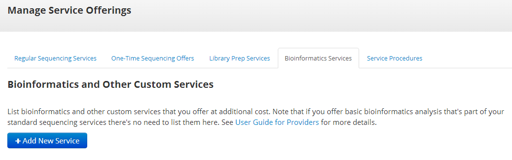 Providers may now list bioinformatic analysis services on the familiar “Manage Services Offerings” page: