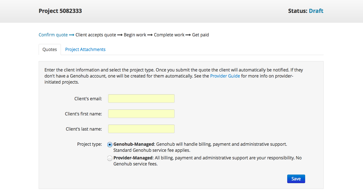 Your confirmation will result in an email notification, giving the client access to the quote. If the client has never used Genohub in the past, an account will be instantly created and login information sent to the client. If you’re not ready to submit the quote, simply save it and come back to it later via your Project Dashboard.